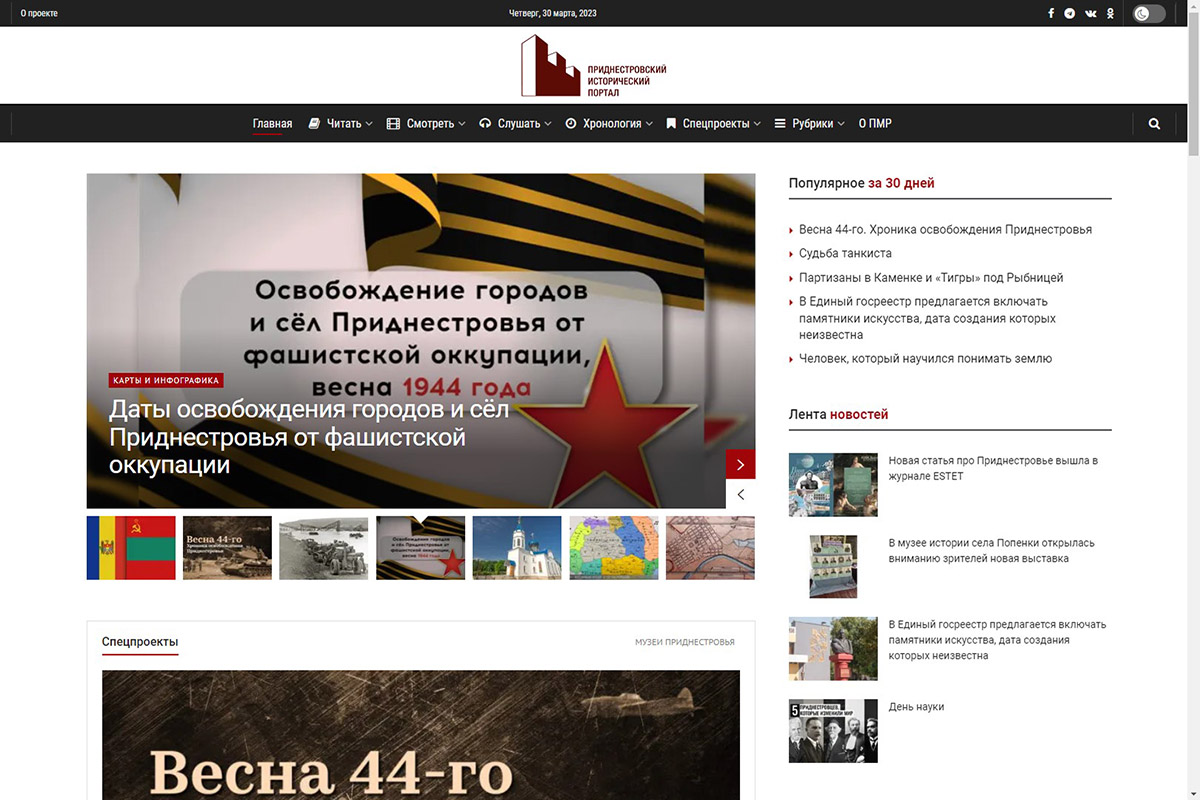 Запущен Приднестровский исторический портал. Это интернет-ресурс, на котором публикуются материалы по истории Приднестровья – от каменного века и до наших дней. Портал разработан ГУ «Приднестровская газета», курировало работу Министерство цифрового развития, связи и массовых коммуникаций ПМР.
