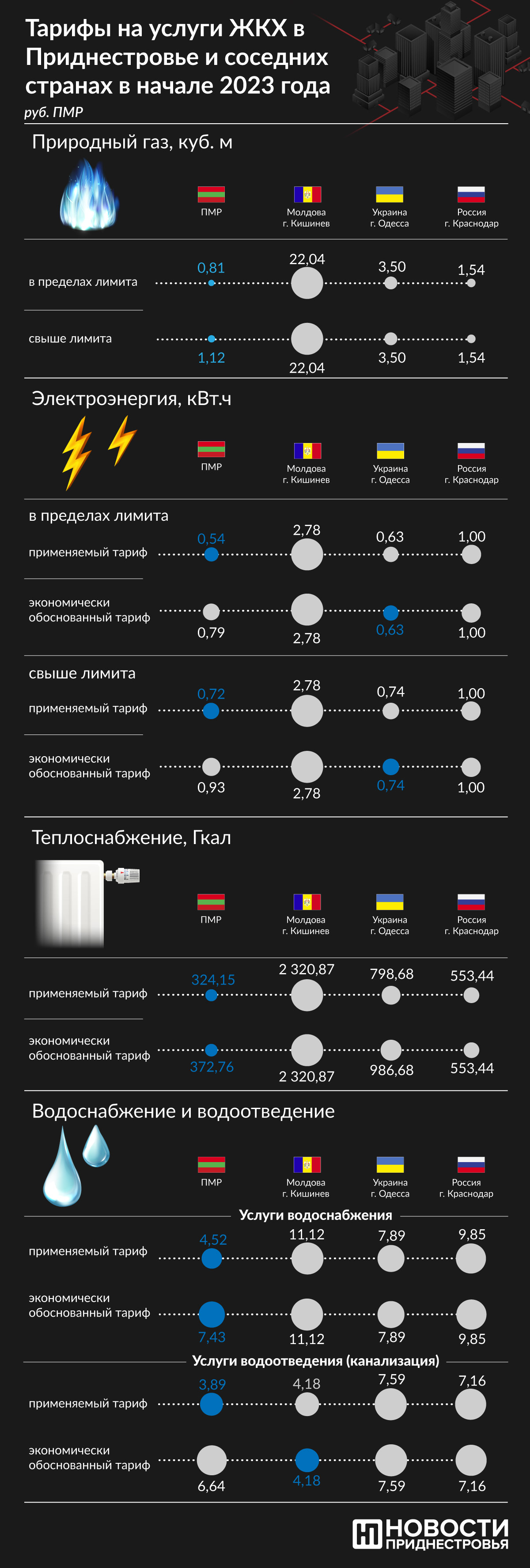 Нормативы потребления коммунальных услуг в 2023 году останутся неизменными. На этой неделе их утвердило Правительство. Стоит отметить, что тарифы на услуги ЖКХ в Приднестровье по-прежнему существенно ниже, чем в Молдове, Украине и России. Сравнение стоимости наглядно демонстрирует наша инфографика.