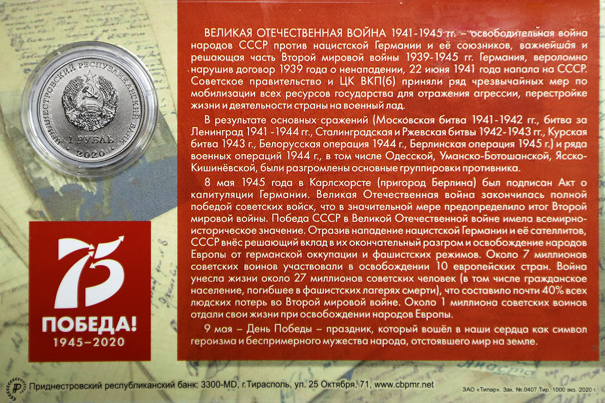Тирасполь, 6 мая. /Новости Приднестровья/. К 75-летнему юбилею Великой Победы Приднестровский республиканский банк ввёл в обращение памятные монеты и купюры, сообщает пресс-служба Цетробанка.