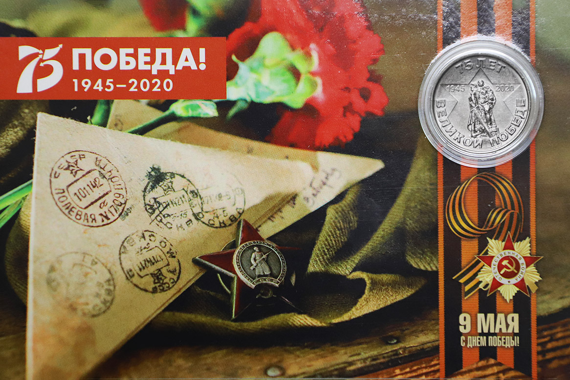 К юбилею Победы Центробанк также выпустил буклеты с памятными монетами из недрагоценных металлов номиналом 1 рубль «75 лет Великой Победы».