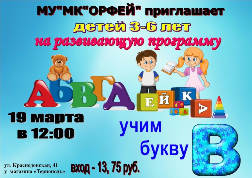 Также, юные жители Тирасполя в воскресенье вместе с родителями смогут посетить МУ «МК «Орфей”", в котором проходит познавательная интерактивная программа «АБВГДейка». Играя в нее, малыши в возрасте от трех до шести лет узнают о том, какие буквы существуют в русском алфавите. Темой нынешнего занятия станет буква «В». Начало в 12:00. Билеты можно приобрести в кассе молодежного клуба «Орфей».