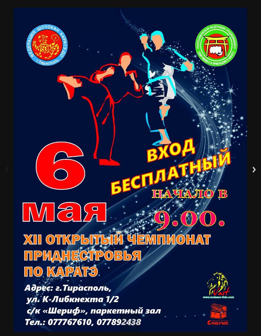 6 мая в столице пройдет XII открытый чемпионат Приднестровья по каратэ. Соревнования будут проведены на паркетном зале спорткомплекса «Шериф».