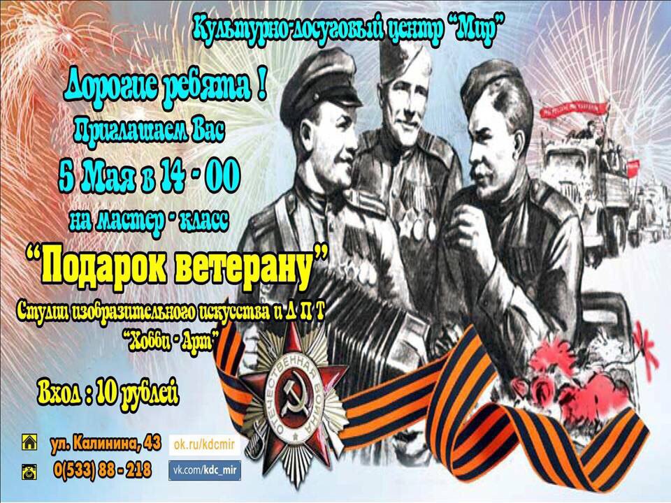 5 мая в культурно-досуговом центре «Мир» пройдет мастер-класс на тему «Подарок ветерану». Его проведет студия изобразительного искусства и ДПТ «Хобби Арт».