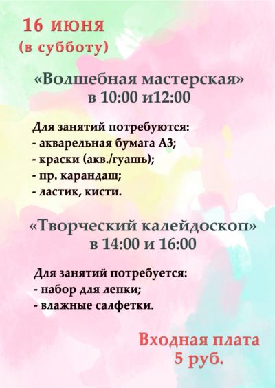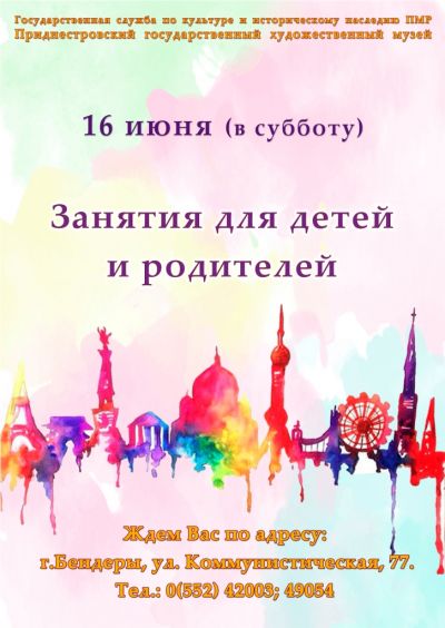 Приднестровский государственный художественный музей, расположенный в Бендерах, проводит занятия по проектам «Волшебная мастерская» и «Творческий калейдоскоп». Они рассчитаны на детей от 3 до 12 лет. Начало в 10:00, 12:00, 14:00 и 16:00. Стоимость одного занятия – 5 рублей.