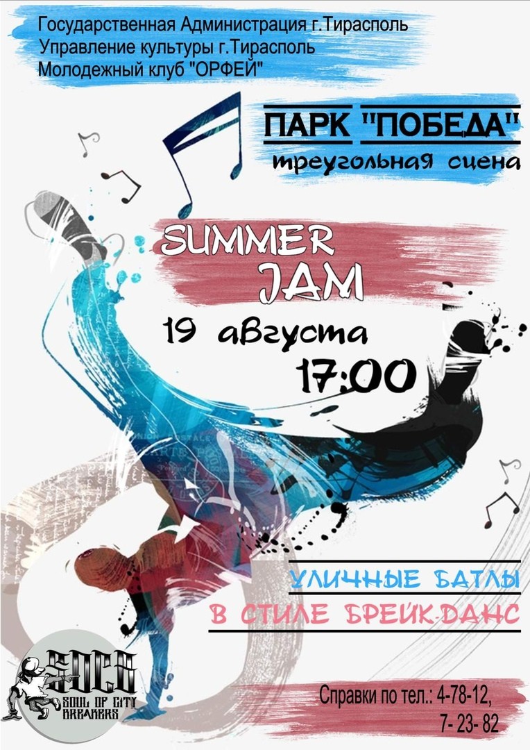 В Тирасполе в это же время в парке «Победа» начнутся уличные батлы «В стиле брейк-данс» образцового коллектива «Душа городских брейкеров». Мероприятие проводится Управлением культуры и молодёжным клубом «Орфей».