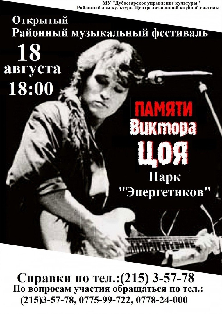 Дубоссары станут центром советского рока. Здесь, в парке Энергетиков, проведут первый фестиваль памяти знаменитого Виктора Цоя. Участниками концертной программы станут городские исполнители и гости из других городов и районов республики. Фестиваль начнётся в 18:00.