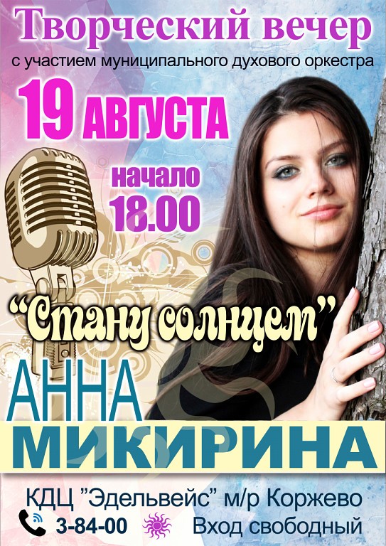 В 18:00 в дубоссарском культурно-досуговом центре «Эдельвейс» (м/р Коржево) состоится творческий вечер Анны Микириной с участием муниципального духового оркестра. Вход свободный.