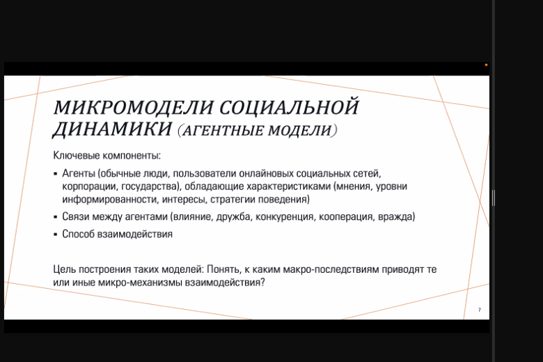 «Оказалось, что начальные подписки, их политическая ангажированность предсказали, в какой информационной … камере окажется бот в будущем… Информационная камера – это когда вы получаете только ту информацию, которая полностью соответствует вашим взглядами и не приемлете никакой альтернативной точки зрения… Эти структуры легко уязвимы относительно фейковых новостей: поскольку ваше мнение совпадает с мнением источника новостей, вы просто можете не заметить, что вам отправили какую-то ложную новость. А вы её приняли, потому что вы разделяете мнение, которое она передает и у вас отсутствует какой-то объективный взгляд на данный вопрос», – пояснил лектор.