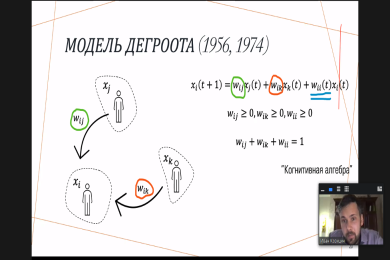 «Это модель очень простая, но вместе с тем она была эмпирически подтверждена во многих лабораторных исследованиях, в рамках которых следили, как люди меняют своё мнение. Более того, эта модель в какой-то степени провалидирована на онлайновых социальных сетях. Учёные проводили эксперименты, они смотрели, как меняется мнение людей, и сопоставляли данную динамику с моделью Дегроота. Оказалось, что она, действительно, неплохо описывает реальные процессы», – рассказал Иван Козицин.