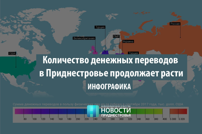 Лидером как по входящим, так и по исходящим денежным переводам по-прежнему остаётся Россия. Оттуда в сентябре жителям ПМР было отправлено в долларовом выражении 5,3 млн. Наоборот, в РФ из ПМР поступило 1,75 млн долл.