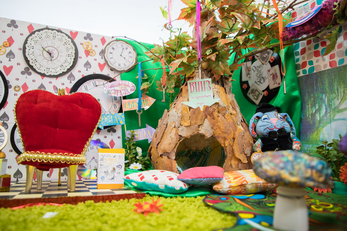 «Комната необычна, как и сама сказка Льюиса Кэрролла. Интерьер отражает историю маленькой девочки, провалившейся в кроличью нору. Кстати, она тут тоже есть, выполнена из тыквы, обмотана бумагой и обклеена корой дерева», - отмечает юная мастерица.