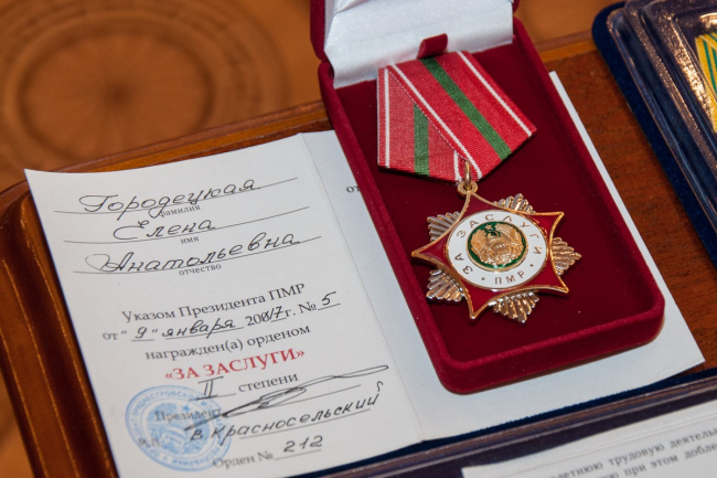 Председатель Центральной избирательной комиссии Елена Городецкая в этот день получила из рук президента орден «За заслуги» II степени. Выступая перед своими коллегами, руководитель Центризбиркома отметила роль избирательных комиссий в становлении Приднестровья как демократического государства.