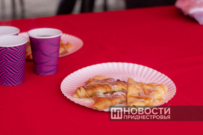 Выпекали прямо на улице, подавали с пылу с жару. Одна порция - 25 рублей. Заместитель директора «Нашей марки» Нина Белоброва рассказала, что сегодня приднестровцы особое предпочтение отдавали сладким блинчикам – с разными топпингами, сгущенкой и шоколадом.