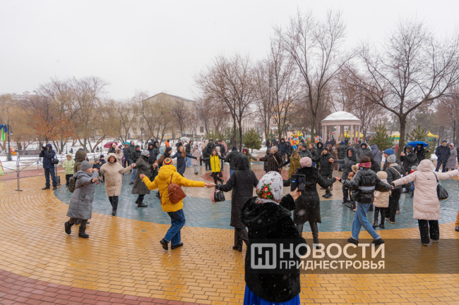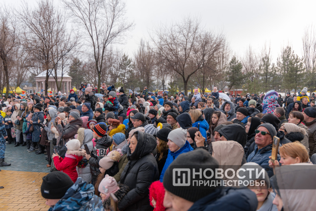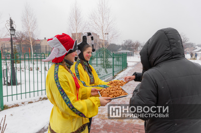 В начале программы развлекали публику и не давали замерзнуть актёры театра юного зрителя «Синяя птица». Масленичные конкурсы с аниматорами и, конечно, легенды о Масленице стягивали всё больше людей у сценической площадки парка. Детей увлекали весёлыми играми на внимательность и тематическими загадками о Масленице. Юные приднестровцы отвечали на вопрос, с чем можно есть блины, пытались за время донести коромысло с ведрами, бегали на перегонки и не только.