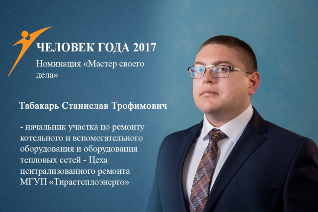 Тирасполь, 16 февраля. /Новости Приднестровья/. В номинации «Мастер своего дела» Государственного художественно-публицистического конкурса «Человек года – 2017» победил начальник участка по ремонту котельного и вспомогательного оборудования и оборудования тепловых сетей цеха централизованного ремонта межрайонного ГУП «Тирастеплоэнерго» Станислав Табакарь.