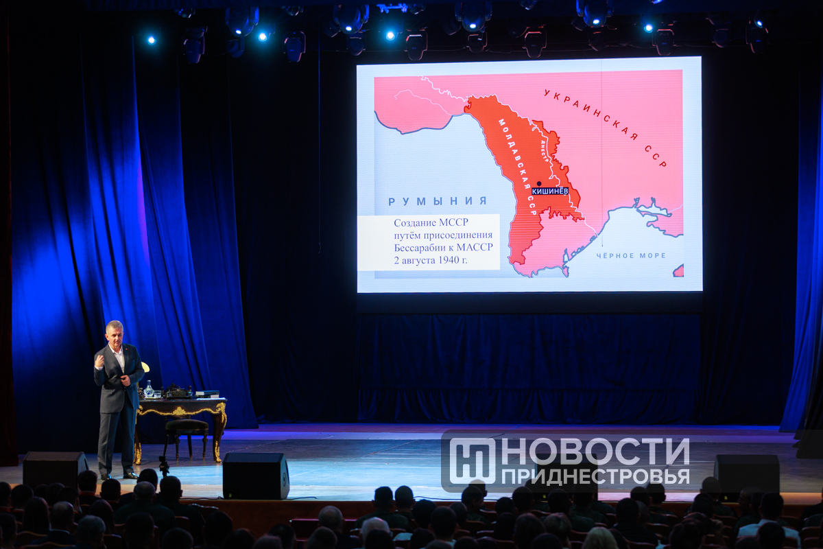Президент обратил внимание, что формирование приднестровского народа продолжалось и после крушения Российской империи. Этот геополитический катаклизм привёл к Гражданской войне (1918-22 гг.), после которой возникло новое государство – Советский Союз. В его составе была создана первая республика в Приднестровье – в ответ на оккупацию Бессарабской губернии Румынией в 1924 году в долине Днестра провозглашается Молдавская Автономная ССР, где ускоряется экономическое и культурное развитие. Важно отметить, что первая республика позволила сохранить молдавскую культуру и этнос как часть приднестровского народа, отметил Вадим Красносельский.