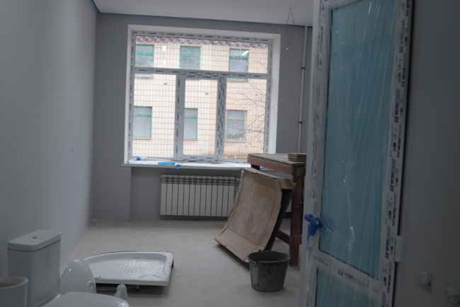 В здании уже полностью заменили окна и двери, провели коммуникации, в палатах и коридорах кладут плитку. Привезли сантехнику. Ремонт продолжается.