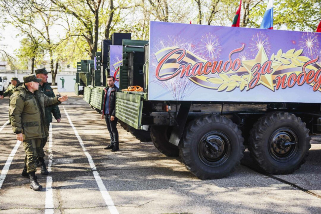Утром 9 мая празднично украшенные грузовики с символами Победы приедут к дому каждого ветерана во всех населённых пунктах Приднестровья, а творческие коллективы поздравят героев войны музыкальными и танцевальными номерами.