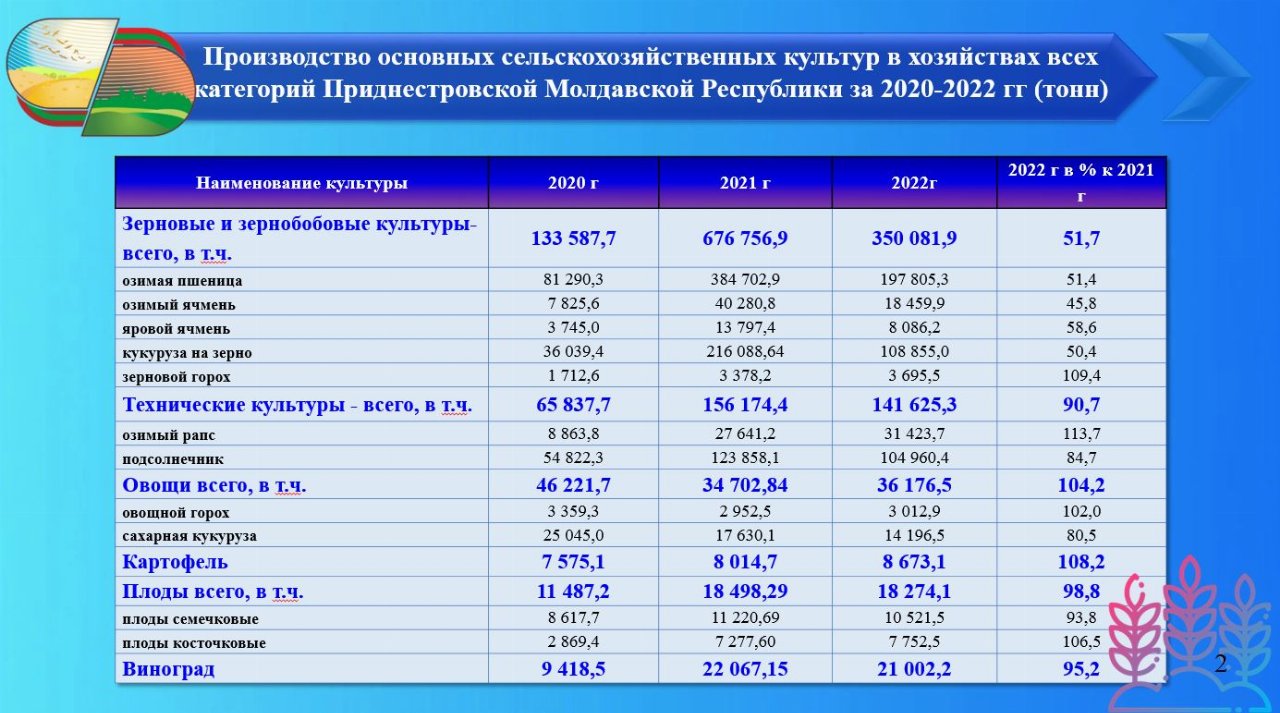 Несмотря на неблагоприятные погодные условия, в 2022 году удалось сохранить показатели урожая важнейших сельскохозяйственных культур на достаточном уровне. При этом наблюдалось снижение вдвое объёмов производства зерновых и пшеницы к уровню 2021-го, что было обусловлено недостатком влаги в почве в период сева. Но полученных объёмов хватило для того, чтобы удовлетворить потребность государства в хлебе и обеспечить поставку зерна на экспорт.