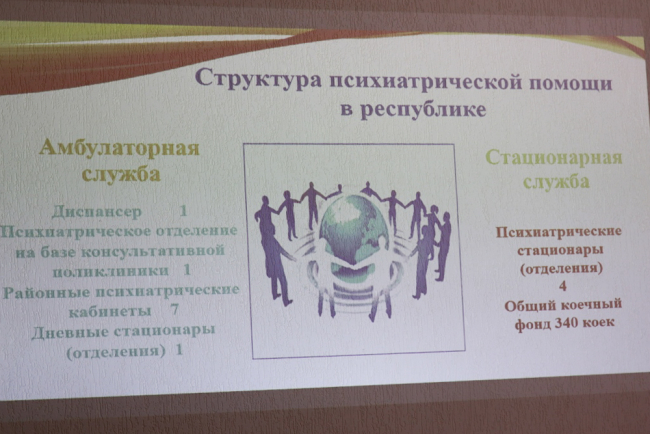 Участникам была представлена информация о структуре психиатрической помощи в нашей республике. Психиатрическая сеть представлена амбулаторной и стационарной службами, консультации ведутся во всех городах и районах, а коечный фонд предусматривает 340 коек. В составе службы один диспансер, одно психиатрическое отделение на базе консультативной поликлиники в Бендерах, 7 кабинетов в районах, один дневной стационар и четыре психиатрических стационара (отделения).