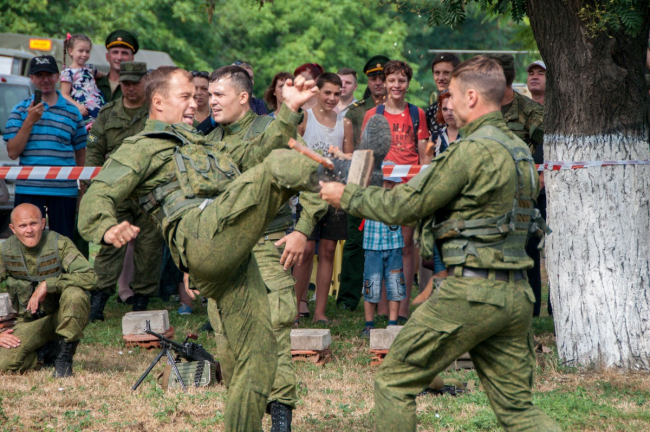 После церемонии награждения миротворцев состоялись показательные выступления военных. На очерченном квадрате спецназовцы продемонстрировали приёмы рукопашного боя, работу в связках, молниеносный захват противника. Действо сопровождалось оглушительной стрельбой из автоматов и пулеметов.