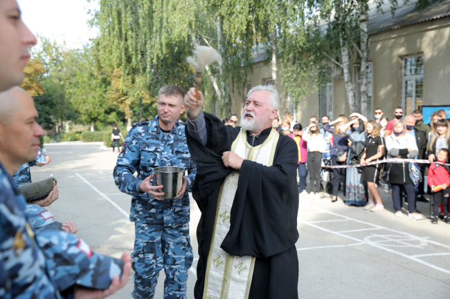 Настоятель церкви святого Архангела Михаила протоиерей Фёдор произнёс молитву на начало служения и окропил всех, кто присутствовал на церемонии, святой водой.