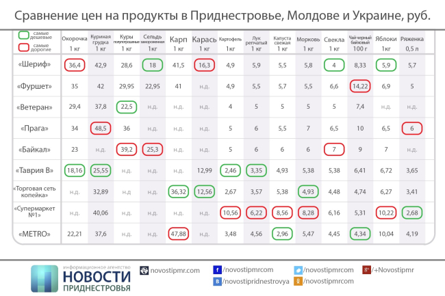 23 Май, 2016, 12:24Тирасполь, 23 мая. /ИА «Новости Приднестровья»/. Комитет цен и антимонопольный деятельности ПМР опубликовал результаты мониторинга цен на продовольственные товары в Приднестровье и соседних регионах. Специалисты Комитета и Госстата ПМР сравнили цены на товары, присутствующие на полках тираспольских «Шерифа», «Фуршета» и «Ветерана», бендерской «Праги», рыбницкого «Байкала», одесских «Таврии» и ООО «Торговая сеть Копейка», кишинёвских «METRO» и «Супермаркета №1».