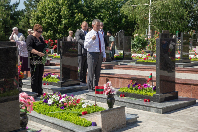 Президент ПМР Вадим Красносельский возложил цветы к памятнику, надпись на мемориальной плите которого призывает каждого склонить голову в знак почтения и благодарности упокоенным здесь воинам-героям, отстоявшим родной город в марте-августе 1992 года.