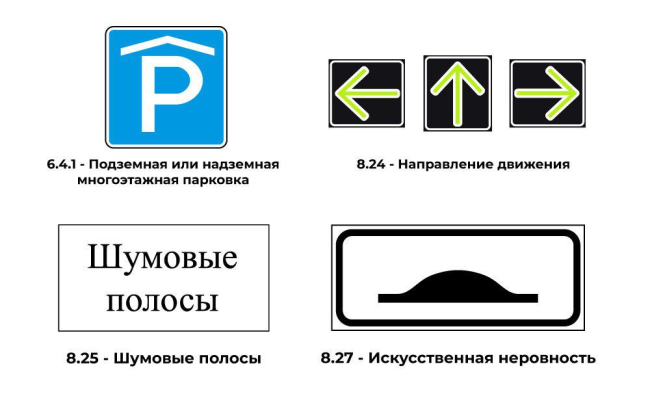 На дорогах появятся также информационные знаки. «Подземная или надземная многоэтажная парковка», «Направление движения», «Шумовые полосы», «Искусственная неровность».