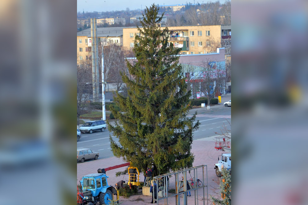 Дубоссары, 16 декабря. /Новости Приднестровья/. На главной площади Дубоссар сегодня установили новогоднюю ель. 12-метровое дерево возрастом 48 лет подарила городу местная жительница Лидия Писаренко. Женщина посадила ель на своём участке, когда только строила дом.