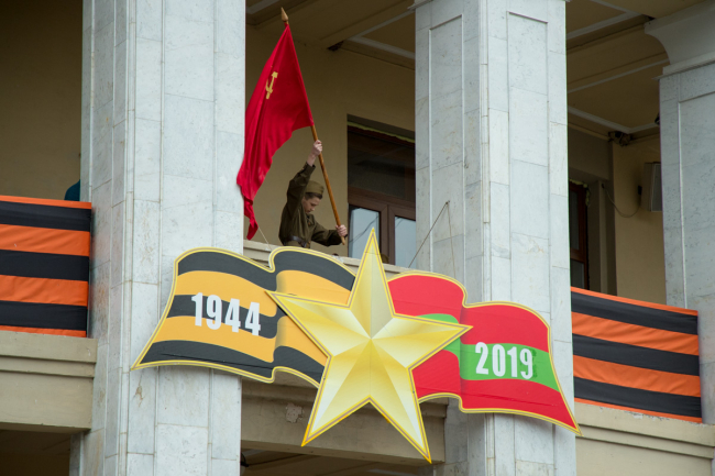 Её участники – тираспольские школьники – перевоплотились в героев весны 44-го. В боевой экипировке эпохи ВОВ они шагали по площади, интерпретируя появление в городе бойцов 37-й армии генерала Шарохина. Части этого подразделения 75 лет назад положили конец фашистской оккупации.