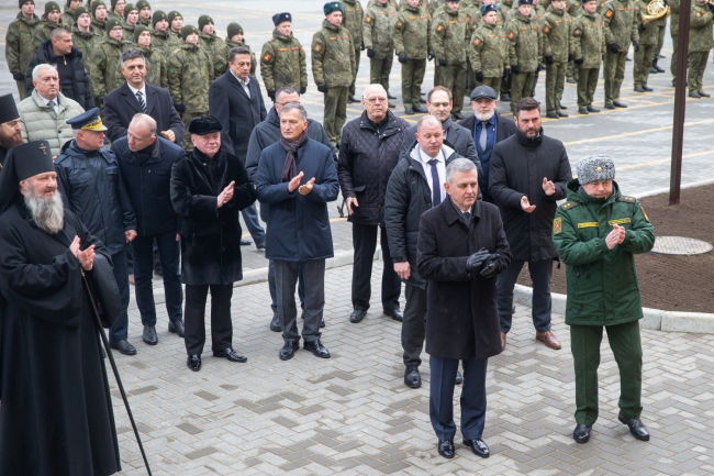 Выбранное место не только логистически, но и исторически соответствует профилю учебного заведения. Ранее на этой площадке располагался первый батальон Республиканской гвардии, позже – подразделение Тираспольского гарнизона. Президент посещал часть с инспекцией в 2019 году. Казарменные помещения требовали срочного внимания. Рядовым ремонтом положение дел было не исправить. Руководитель страны поручил возвести новое здание. Затем назрело еще более кардинальное решение – перевести сюда институт. Проект скорректировали. Несколько лет серьезных строительных работ, внушительные финансовые вложения из госбюджета (свыше 42 миллионов рублей). Сегодня состоялась официальная сдача объекта в эксплуатацию. На новом плацу – порядка 250 человек в военной форме: курсанты института – очники и заочно обучающиеся, офицерский состав, выпускники Тираспольского Суворовского училища, музыканты главного штаба Вооруженных сил ПМР. На трибуне – почетные гости, среди которых Главнокомандующий ВС ПМР Вадим Красносельский.