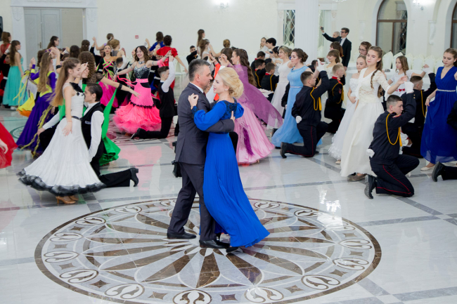 Бал начался с вальса, и не одного: кавалеры и их спутницы кружились под композиции Шостаковича, Чайковского и Штрауса. На танец свою супругу пригласил и Вадим Красносельский.