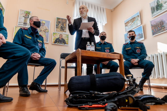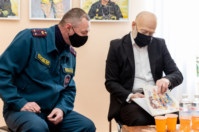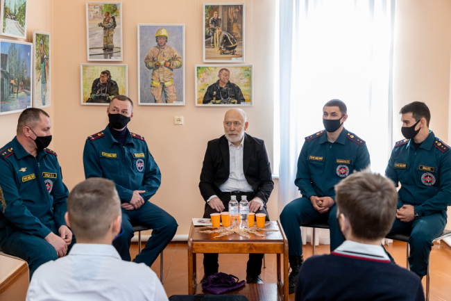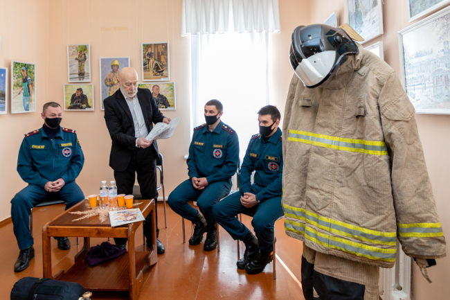 С ребятами беседовал и художник Владимир Мыцыков, который не понаслышке знаком с этой опасной профессией: в прошлом он сам работал пожарным. Недавно он написал серию картин, в которых изобразил людей, чья профессия состоит в том, чтобы защищать и спасать людей. «Герои нашего времени» - так назвал мастер этот цикл работ. Большая их часть посвящена огнеборцам. На картинах изображены реальные события и их участники. Художник делал зарисовки прямо на месте ЧП, наблюдая за действиями пожарных.