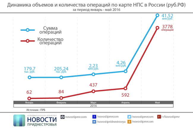 На территории РФ с июля 2015 по май 2016  было совершено  5 380 денежных операций с использованием банковских карт НПС ПМР на общую сумму около 50 млн рублей РФ.