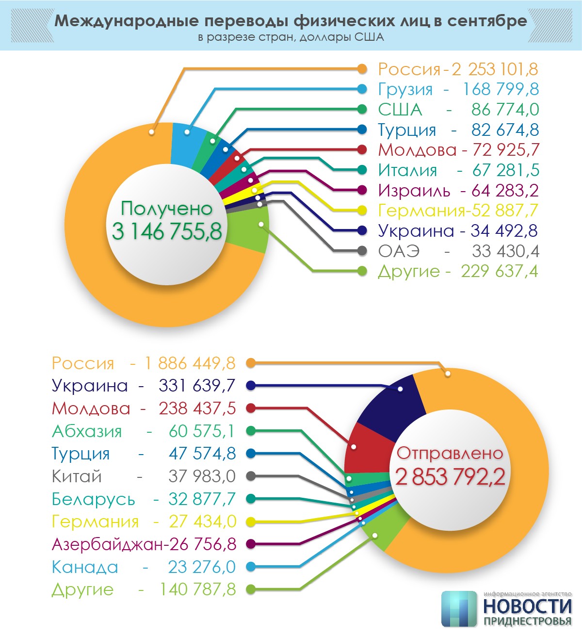 В рейтинге стран, в которые приднестровцы больше всего отправляли деньги, также лидирует Россия, следом за ней располагаются Украина и Молдова.