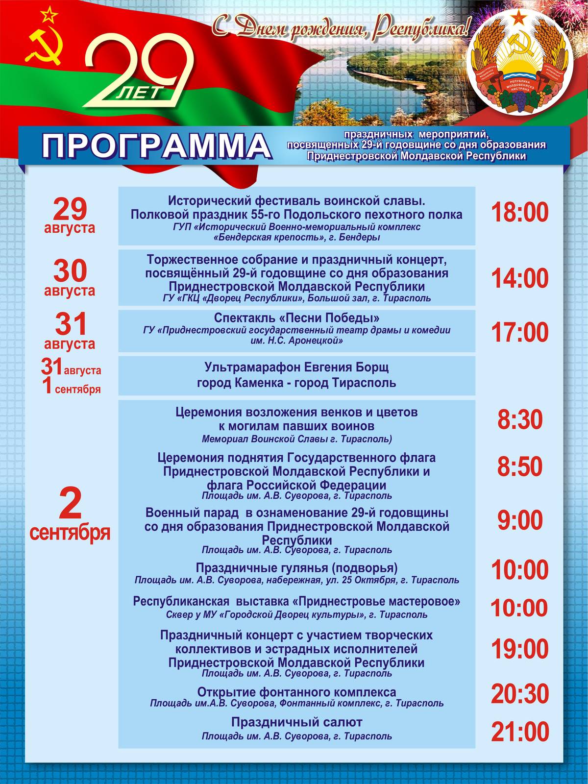 28 Авг., 2019, 12:36Тирасполь, 28 августа. /Новости Приднестровья/. С 29 августа в Приднестровье стартуют мероприятия, посвящённые 29-й годовщине со дня образования республики. Предлагаем ознакомиться с праздничной программой.