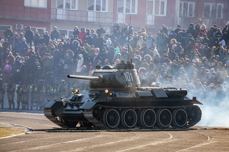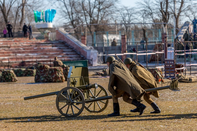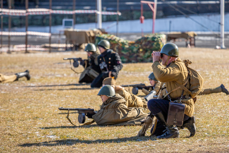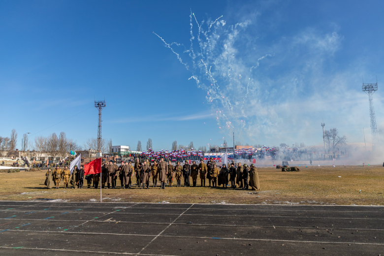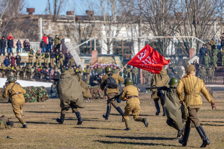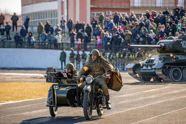 Яркое выступление показали представители ОГРВ. Специально для праздника они реконструировали бой времён Великой Отечественной войны. Главным героем постановки стал комсорг одной из рот первого батальона 129-го стрелкового полка Николай Курило. Свой последний бой солдат закончил под Бендерами. Через его образ российские военные показали, каким сложным был путь советской армии к победе в ВОВ. На поле боя помимо пехоты вышел даже легендарный танк Т-34.