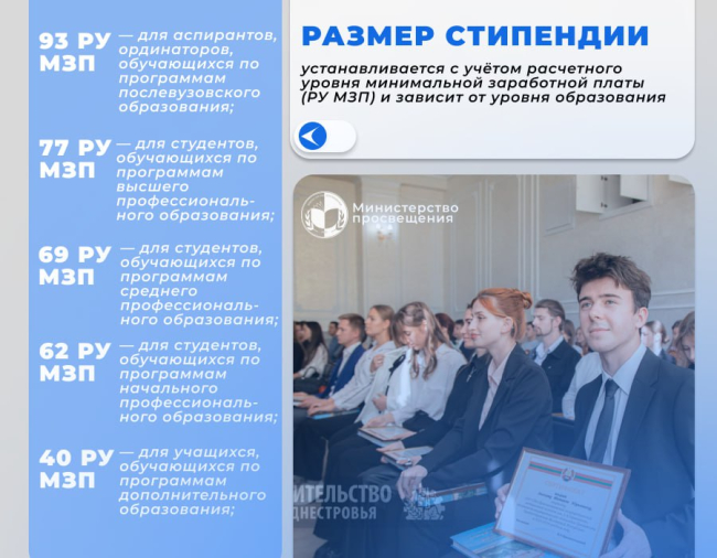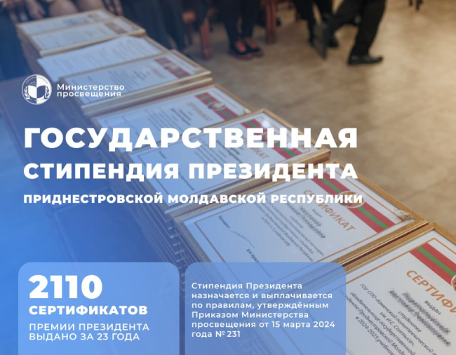 Напомним, что в 2024 году обладателями президентской стипендии стали 108 студентов. Стипендия Президента ПМР - это признание личных достижений и вклад в развитие республики, укрепление её культурных и образовательных традиций.