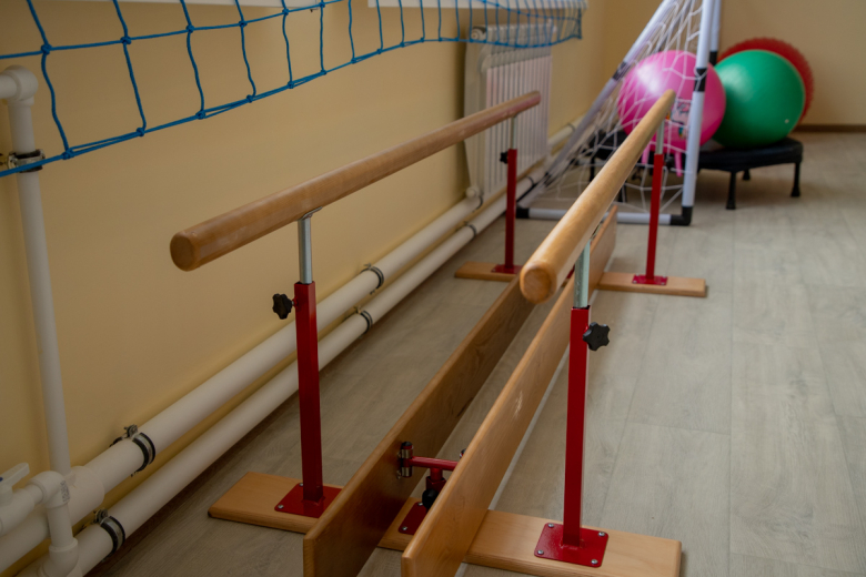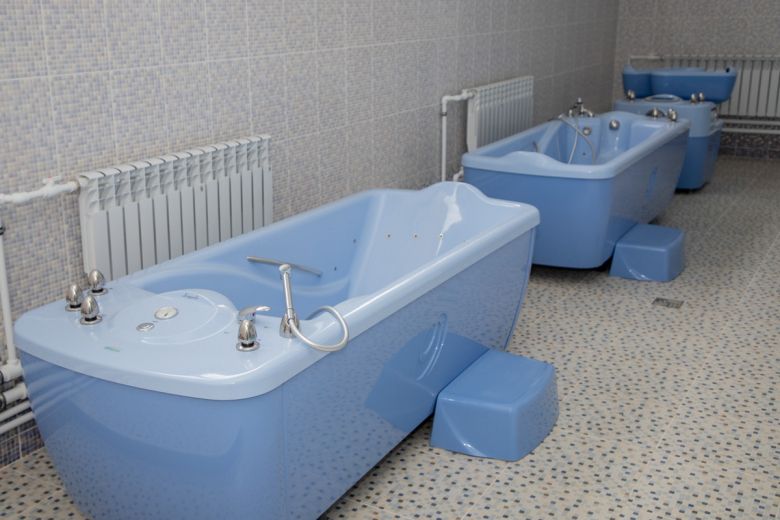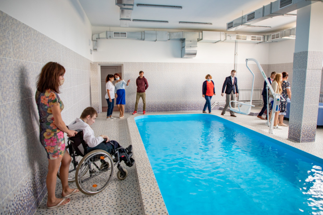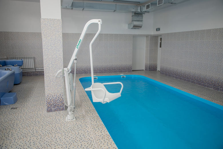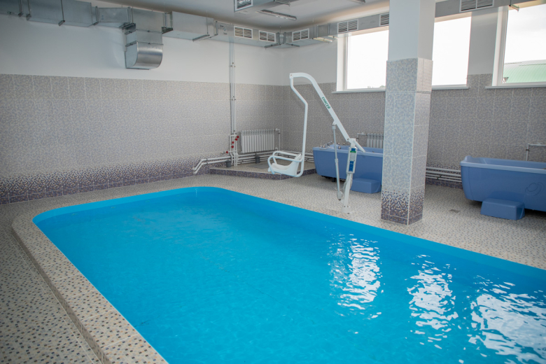 В центре есть отделение медицинской реабилитации. В нём расположена водолечебница, в которой находится бассейн глубиной 80 см. Там вместе с инструктором дети смогут заниматься необходимыми водными процедурами. Рядом с бассейном есть специальное кресло, с помощью которого детей будут погружать в воду. Кроме того, в водолечебнице есть гальваническая ванна, гидромассажные ванны и душ Шарко. О необходимости всех перечисленных процедур рассказал инструктор ЛФК Анжелика Станкевич.