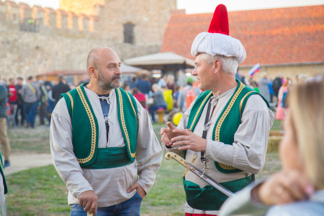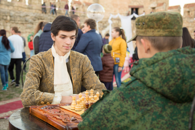 К слову, после 6 вечера на улице похолодало. Согреться можно было горячей ухой, что разливали из огромных посудин. Любители покрепче грелись глинтвейном. Мы же выбрали кофе. Рядом прошла женщина с жёлтым шарфиком и что-то, смеясь, сказала Сулейману. Почему-то мне показалось, что она отвечает за организацию площадок. Чутьё меня не подвело. Женщина рассказала о том, что каждая локация в цитадели так или иначе связана с событиями, которые проходили в крепости в разные эпохи.