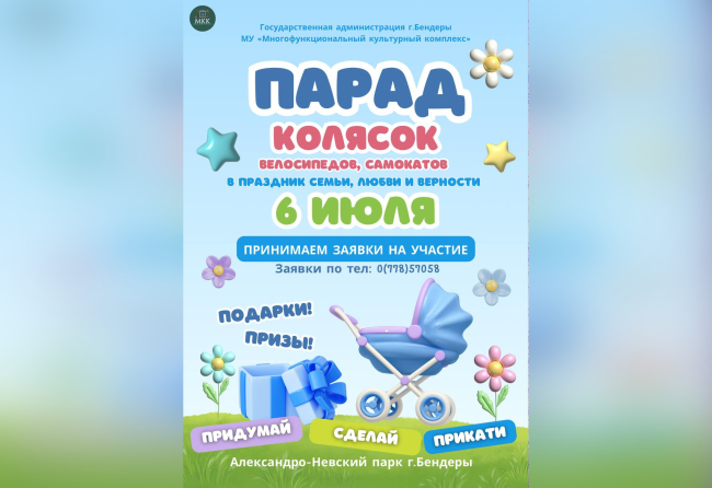 Бендеры, 1 июля. /Новости Приднестровья/. 6 июля, в канун Дня семьи, любви и верности, в Бендерах пройдет парад колясок, сообщил официальный сайт госадминистрации города. К участию в нем приглашаются семьи с детьми. Для этого достаточно оформить коляску (тема оформления – произвольная) и прийти на торжественное шествие. Красочные костюмы приветствуются.