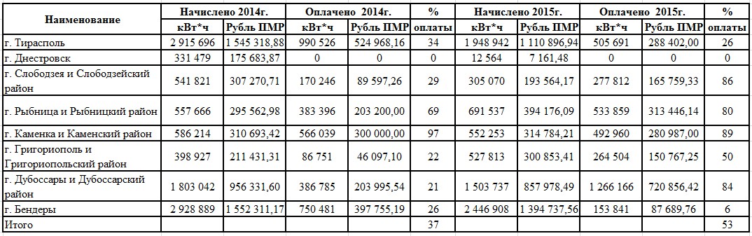 «Наиболее высокий процент оплаты в Каменском районе – 89%. Несколько ниже в Слободзейском, Дубоссарском и Рыбницком районах – соответственно 86, 84 и 80%», – отметила в интервью журналистам начальник Управления развития энергетики и энергосбережения Оксана Бальжик.