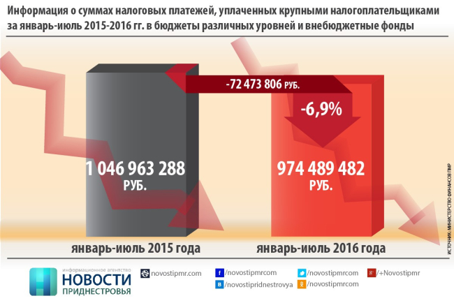 Согласно ей, 27 из 50 крупнейших предприятий в совокупности заплатили налогов на 108 млн рублей меньше, чем за 7 месяцев 2015 года. Оставшиеся 23 крупнейших налогоплательщика перечислили с января по июль 2016 года на 35,5 млн рублей больше, чем за аналогичный период. Таким образом, в общей сложности бюджет Приднестровья по итогам первых семи месяцев недополучил более 72 млн рублей.