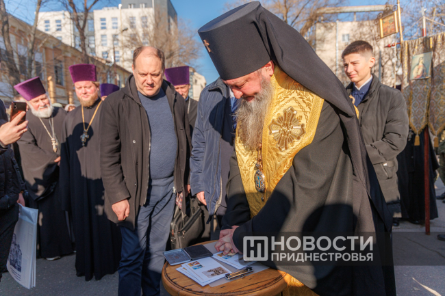 У ЗАГСа, где ранее находился Никольский собор Тирасполя, архиепископ Савва совершил праздничный молебен. Отметим, что сегодня, 19 декабря, православная церковь отмечает День памяти святителя Николая Чудотворца.