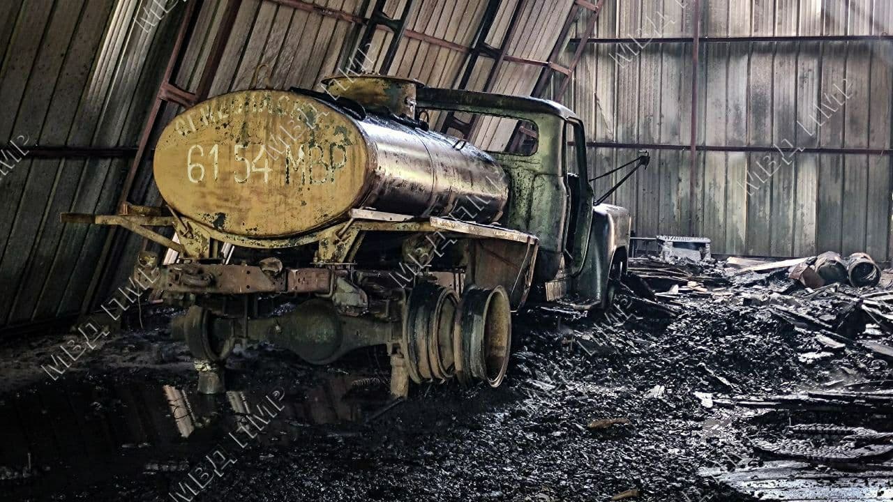 Помещение выгорело полностью, ангар местами повреждён пламенем.
