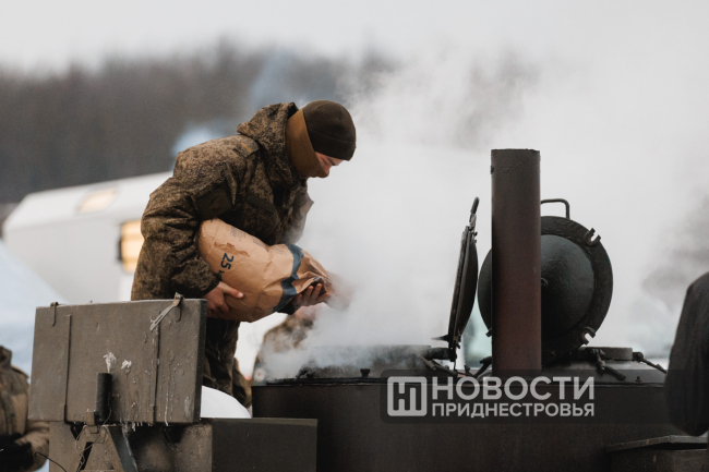 Для удобства людей на берегу поставили палатки для переодевания и обогрева с печками-буржуйками. А к воде проложили деревянные настилы. Рядом работает полевая кухня с горячим сладким чаем.