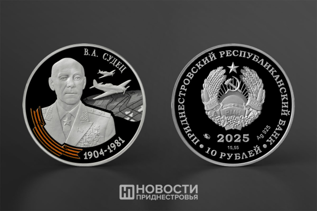 На другой монете изображен Герой Советского Союза, Народный Герой Югославии и Герой Монгольской Народной Республики маршал авиации Владимир Судец, который командовал 17-й воздушной армией, прикрывавшей войска, освобождавшие Приднестровье в ходе Одесской и Ясско-Кишиневской операций.