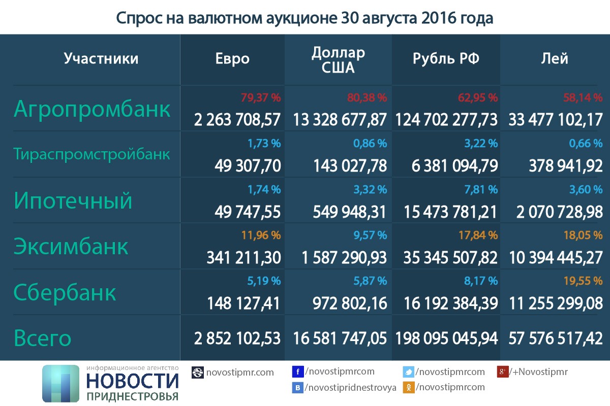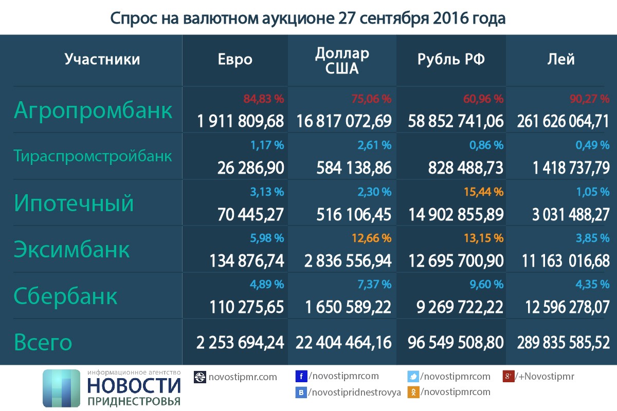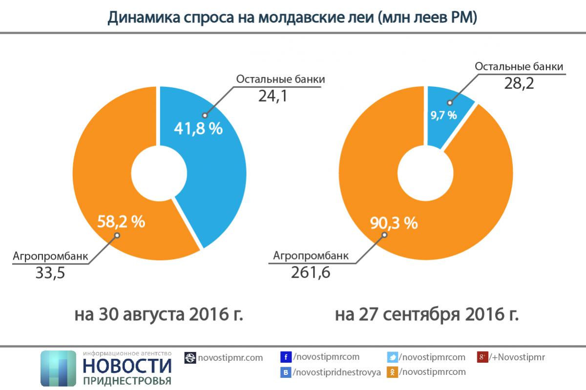 По состоянию на 27 сентября 2016 года (в этот день в телесюжете ТСВ при участии представителя ЗАО «Агропромбанк» была озвучена информация, обвиняющая ПРБ и исполнительные органы власти во «втягивании» ПМР в леевое пространство) совокупный спрос на валюту выглядел следующим образом: