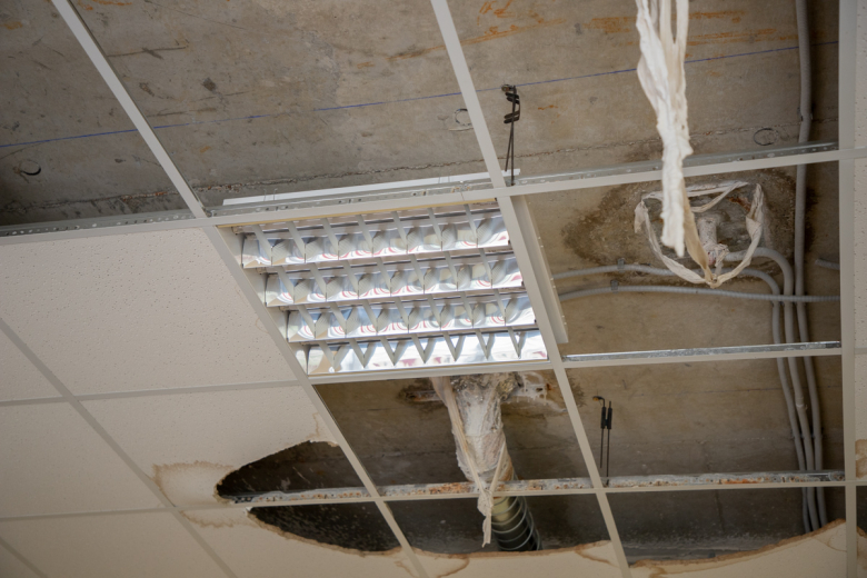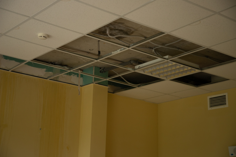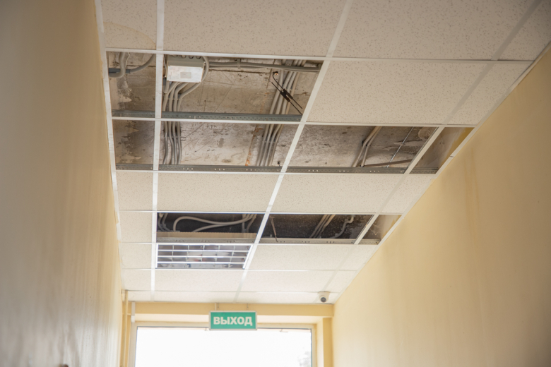 Есть проблемы и с внутренней отделкой. Некоторые фальшпотолки разорваны, и коммуникации висят в открытом доступе, а это нарушение техники безопасности.